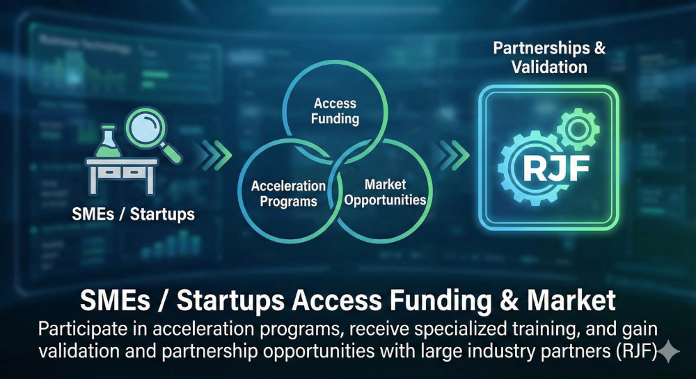 Participate in acceleration programmes, receive specialised training, and gain validation and partnership opportunities with large industry partners (RJF).