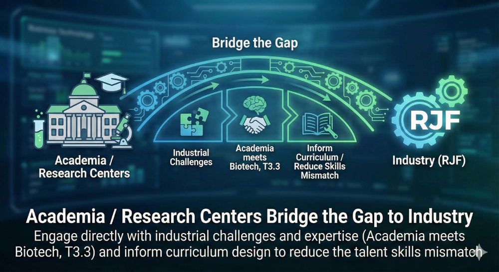 Engage directly with industrial challenges and expertise (Academia meets Biotech, T3.3) and inform curriculum design to reduce the talent skills mismatch.